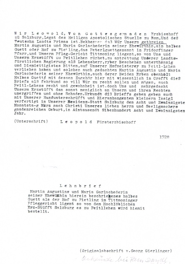 Doch das Anwesen ist viel älter. Es existieren sogar noch Original-Urkunden des Erzbischofs von Salzburg aus den Jahren 1727, 1728 und 1773, in denen die Rechte und Pflichten des „Peterlgütl“ gegenüber dem Lehensherrn,